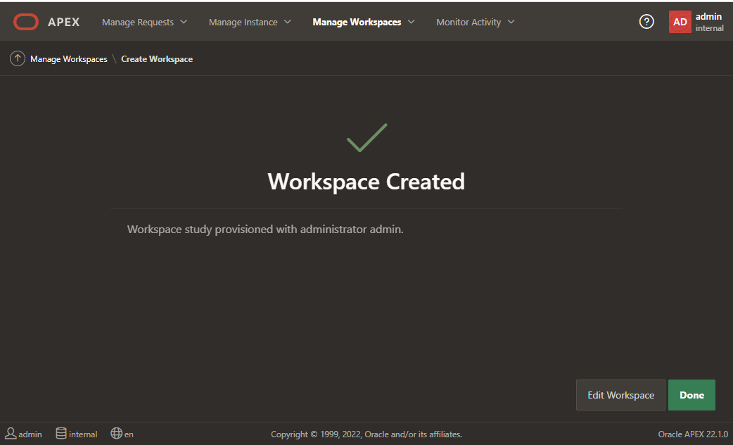 Although APEX includes a default workspace named "internal," it is intended only for administrative purposes.