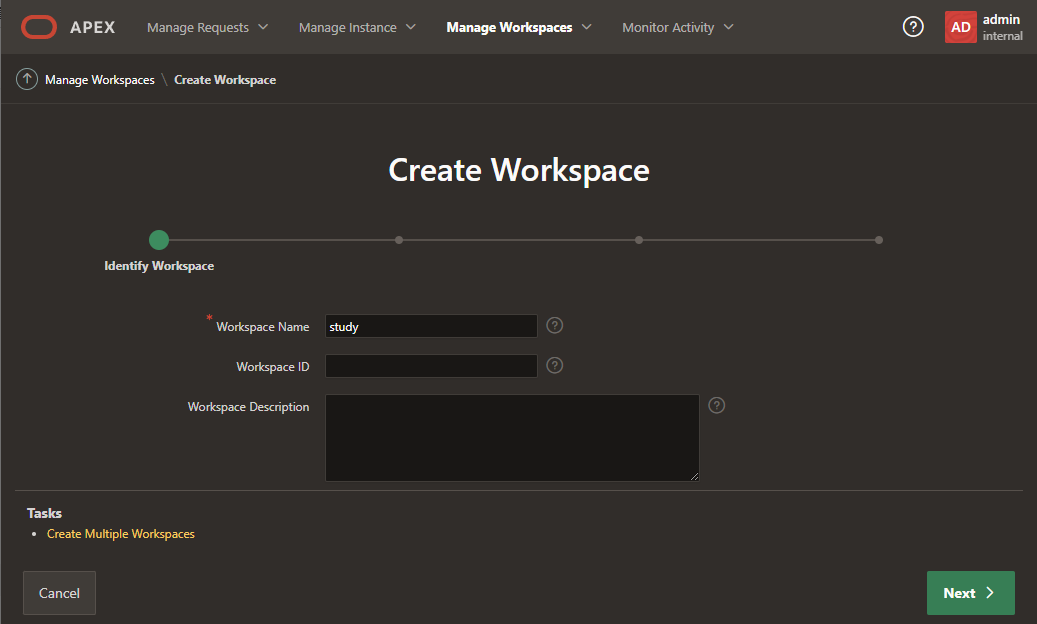 To use APEX, you must create a new workspace: