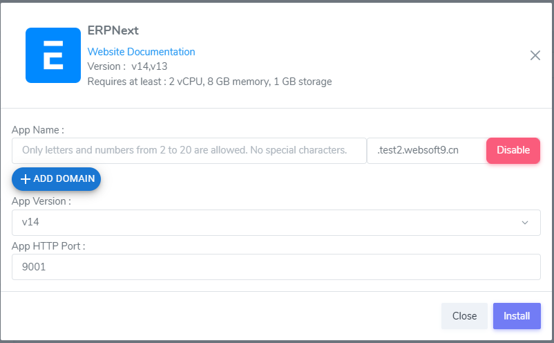 2. Go to Install interface and click +ADD DOMAIN button to add your domain like erpnext.websoft9.cn